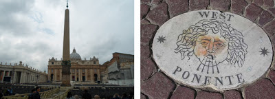 Seguindo a direção apontada pelo anjo (lembre-se do verso: que os anjos o guiem em sua busca sublime) encontramos apenas uma igreja que existia nos tempos de Bernini: a Basílica de São Pedro. Em frente à Basílica, no centro da Piazza São Pedro, está o obelisco egípcio trazido por Calígula, e ao seus redor encontram-se dispostas inúmeras placas elípticas. O monumento feito para marcar